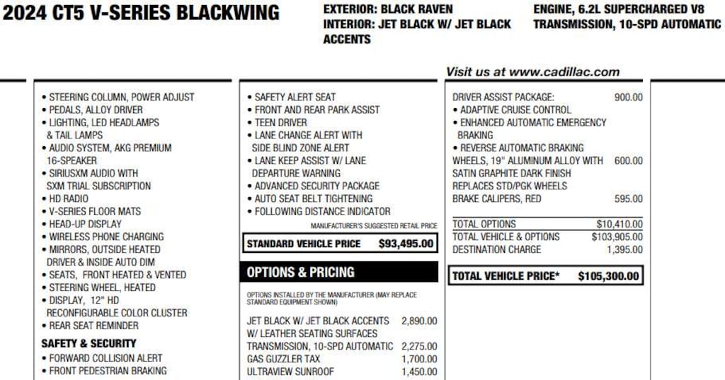 TRANSMISSION, 10-SPEED AUTOMATIC Includes (BTV) Adaptive Remote Start, (KB7) Steering wheel mounted Alloy paddle shift controls, (T8Z) Buckle to Drive, Rotary-jog infotainment controller and (JM8) Automatic vehicle hold brake.), SUNROOF, ULTRAVIEW, DUAL PANE spans both rows of seating, DRIVER ASSIST PACKAGE includes (KSG) Adaptive Cruise Control, (UGN) Enhanced Automatic Emergency Braking and (UVZ) Reverse Automatic Braking, WHEELS, 19" (48.3 CM) ALUMINUM ALLOY WITH SATIN GRAPHITE DARK FINISH (Includes (ROF) 19" high-performance, summer-only tires.), CADILLAC USER EXPERIENCE WITH EMBEDDED NAVIGATION AM/FM stereo with connected navigation providing real-time traffic, 10" diagonal HD color information display, 3 USBs, personalized profiles for each driver's settings, Natural Voice Recognition, Phone Integration for Wireless Apple CarPlay®/Wireless Android Auto® capability for compatible phone, Connected Apps and Teen Driver (STD), ENGINE, 6.2L SUPERCHARGED V8 DI, VVT Active Fuel Management (668 hp [498 kW] and 659 lb-ft torque [893 N-m]) (STD).