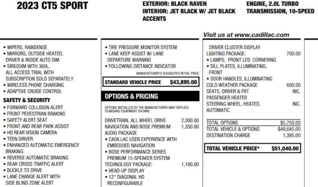Back-Up Camera, Satellite Radio, Onboard Communications System, Aluminum Wheels, Remote Engine Start, Dual Zone A/C, Lane Keeping Assist, WiFi Hotspot, Blind Spot Monitor, Cross-Traffic Alert. Rear Spoiler, Keyless Entry, Heated Mirrors, Bucket Seats, Electrochromic rearview mirror. Cadillac Sport with Black Raven exterior and Jet Black with Jet Black Accents interior features a 4 Cylinder Engine with 237 HP at 5000 RPM*. CARFAX 1-Owner 172-Point Vehicle Inspection, including road test performed by trained Cadillac technicians, 1 year-unlimited mile Limited Warranty upon expiration of the New Vehicle Limited Warranty, $0 Deductible, All scheduled maintenance performed and up to date, Can be serviced at any Cadillac dealer nationwide, Digitally equipped vehicles are eligible for 3 trial months of OnStar Directions and Connections, 24-Hour Roadside Assistance with Courtesy Transportation, Satellite radio-equipped vehicles include a 3-month trial to SiriusXM All Access package Reduced from $36,888. This CT5 is priced $6,100 below Kelley Blue Book.