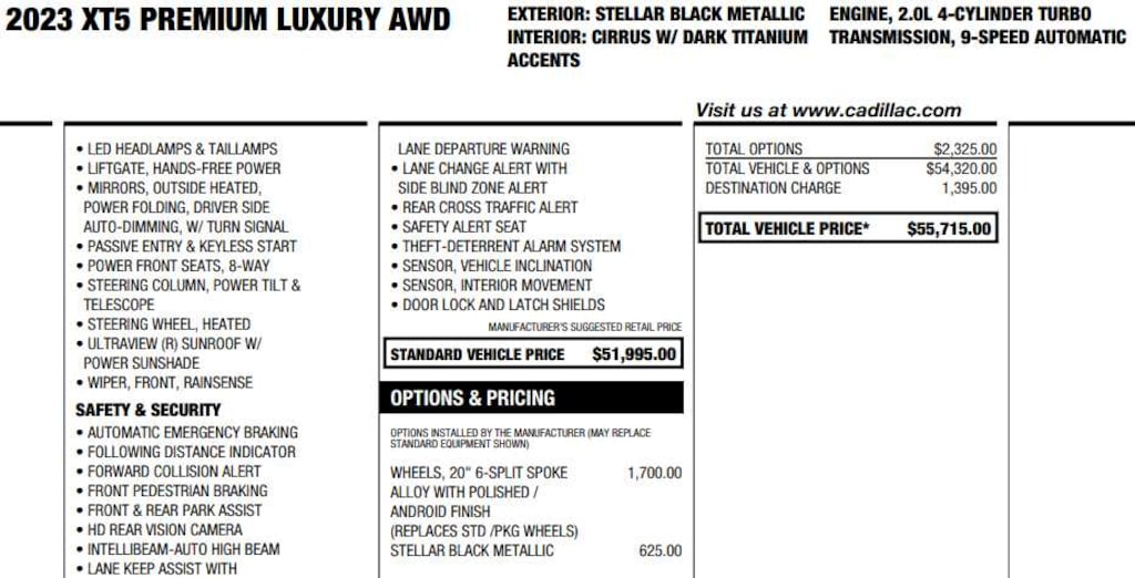 WHEELS, 20" (50.8 CM) 6-SPLIT SPOKE ALLOY with Polished/Android finish, CADILLAC USER EXPERIENCE WITH EMBEDDED NAVIGATION, AM/FM STEREO with connected navigation providing real-time traffic, 8" diagonal color information display, 4 USBs, 2 auxiliary power outlets, personalized profiles for each driver's settings, Natural Voice Recognition, Phone Integration for Wireless Apple CarPlay®/Wireless Android Auto® capability for compatible phone, Connected Apps and Teen Driver (STD), ENGINE, 2.0L TURBO, 4-CYLINDER, SIDI with Automatic Stop/Start (235 hp [175 kW] @ 5000 rpm, 258 lb-ft of torque [350 N-m] @ 1500-4000 rpm) (STD), TRANSMISSION, 9-SPEED AUTOMATIC (STD).