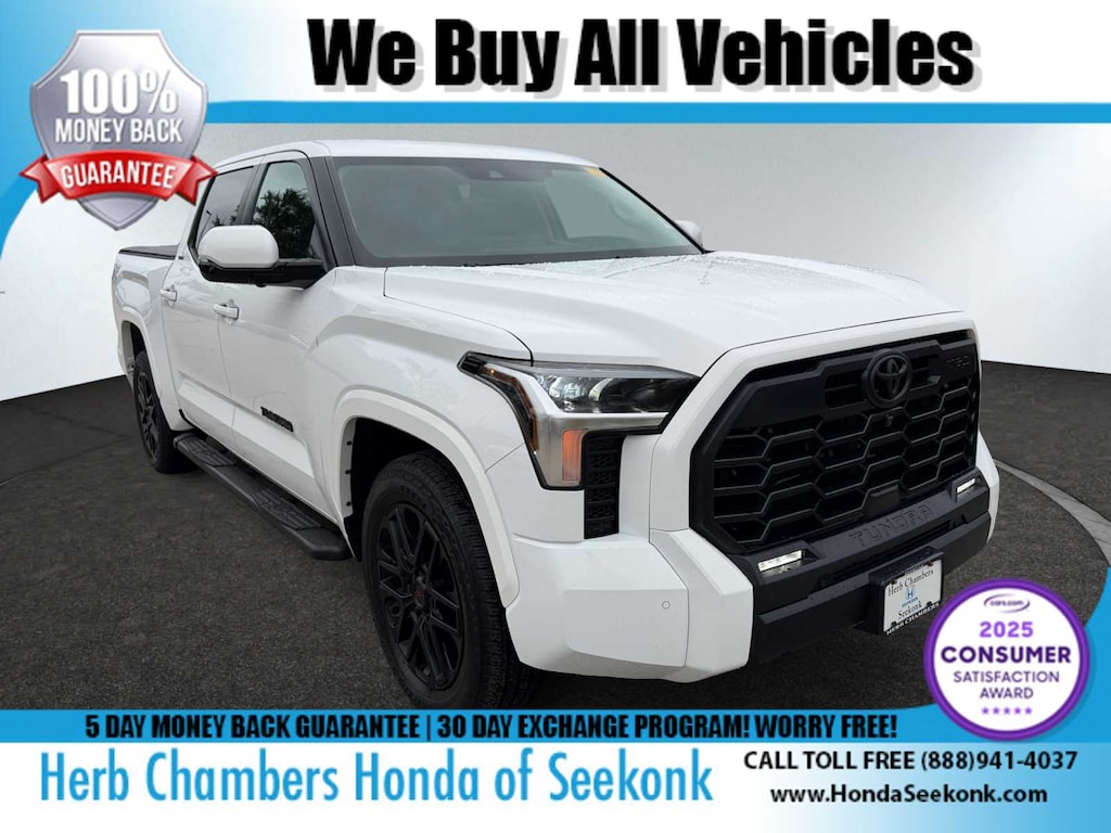 Wheels: 20 Black Alloy, Tires: 265/60R20, Blind Spot Monitor w/Lane Change Assist, Towing Package, 32 Gallon Fuel Tank, LEV3, Multi-Terrain Back Monitor, Parking Support Alert/Brake, 14 touchscreen audio multimedia, 9 speakers, Android Auto®, Apple CarPlay®, SiriusXM w/3-month platinum plan trial subscription, See toyota.com/audio-multimedia for details, Heated, LED turn signal, Panoramic View Back Monitor, BLACK DUAL-STEP RUNNING BOARD (TMS), HEATED LEATHER STEERING WHEEL. Toyota SR5 with Ice Cap exterior and Black interior features a V6 Cylinder Engine with 389 HP at 5200 RPM*. CARFAX 1-Owner This Tundra is priced $300 below Kelley Blue Book.